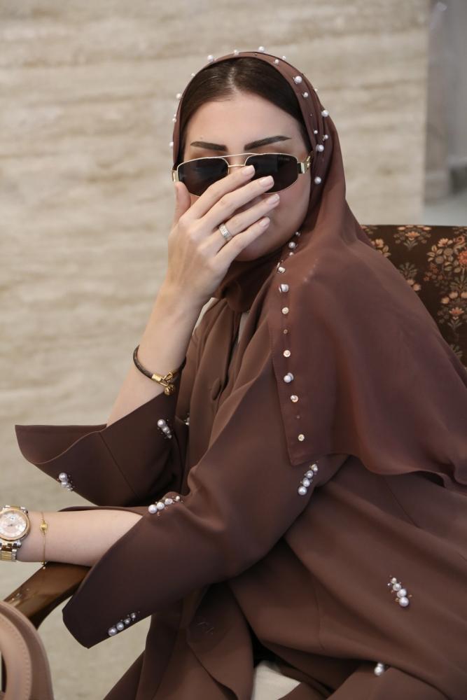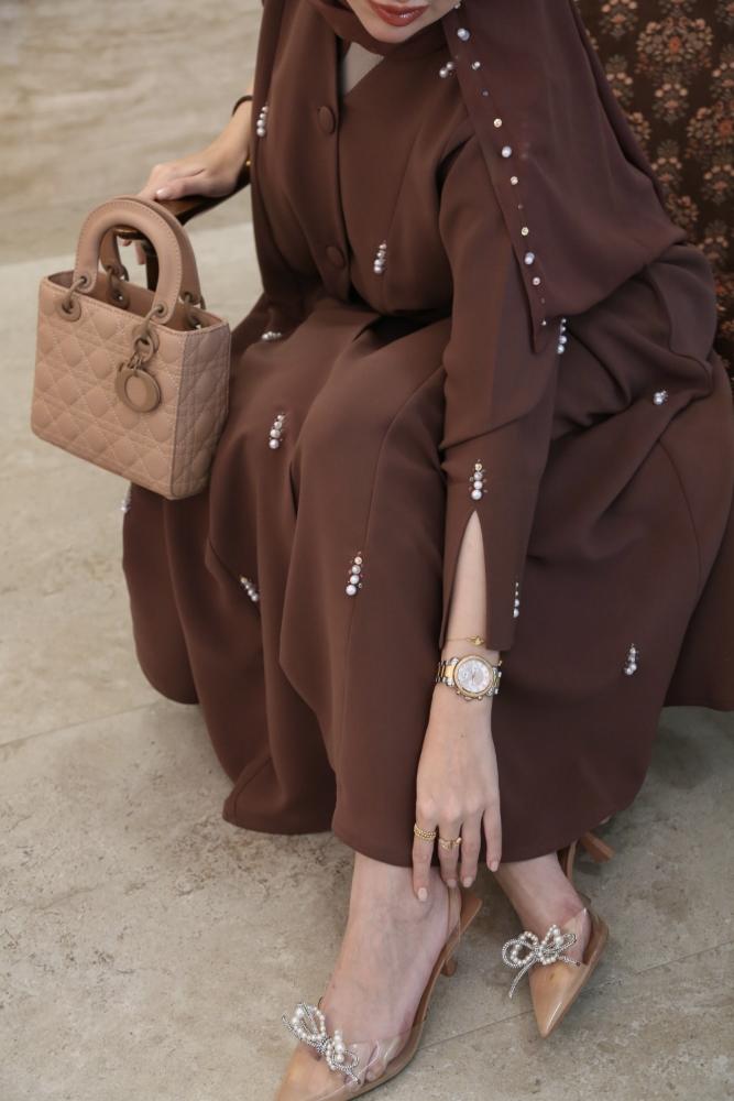 عباية كريب كوري بني بتصميم كلوش وتزيين بشك اللؤلؤ ✨