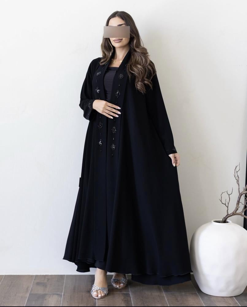 عباية أنثوية راقية مصنوعة من قماش الكريب الكوري الفاخر، تتميز بـ قصة كلوش واسعة تمنحك انسيابية وأناقة في الحركة. التصميم مزين بـ شك ناعم على طول الصدر والأكمام، ليضيف لمسة فخمة وبراقة دون مبالغة.