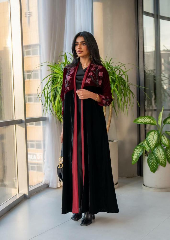 عباية مخمل كوري فاخرة بتصميم كلوش وشك يدوي مميز