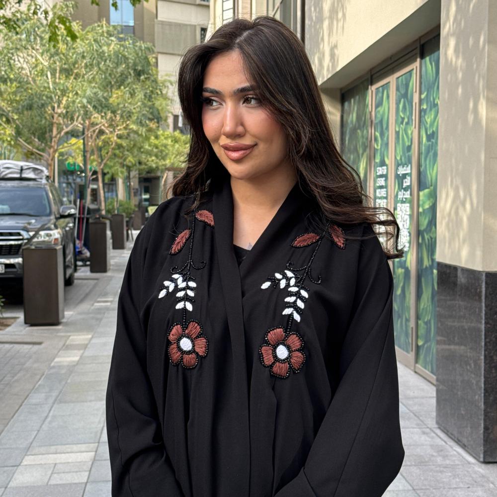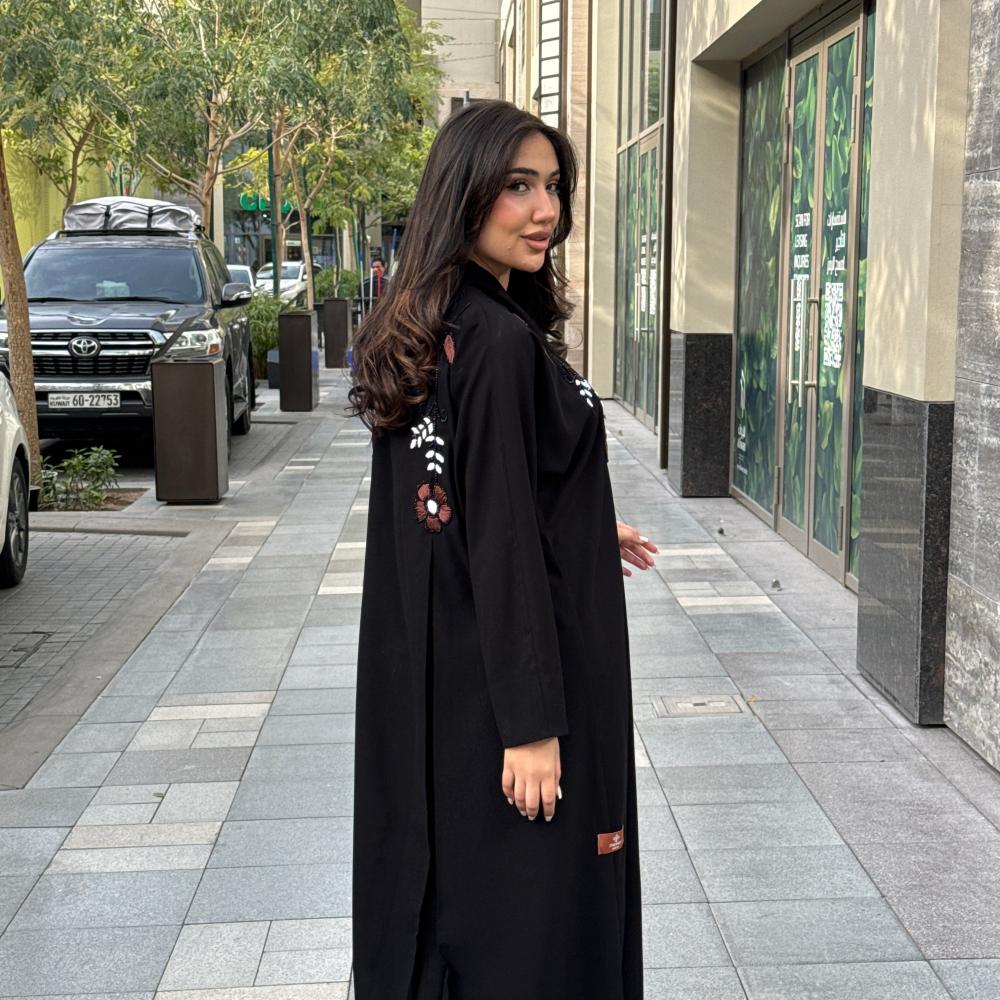 عباية كريب كوري سوداء بتطريز ورود وكسرات أمامية وخلفية بقصة كلوش ✨
