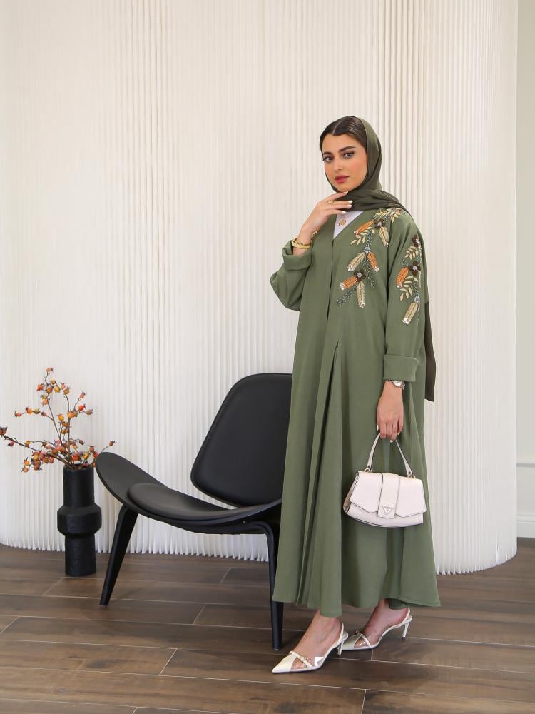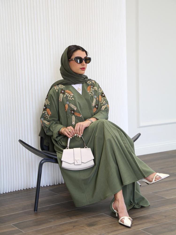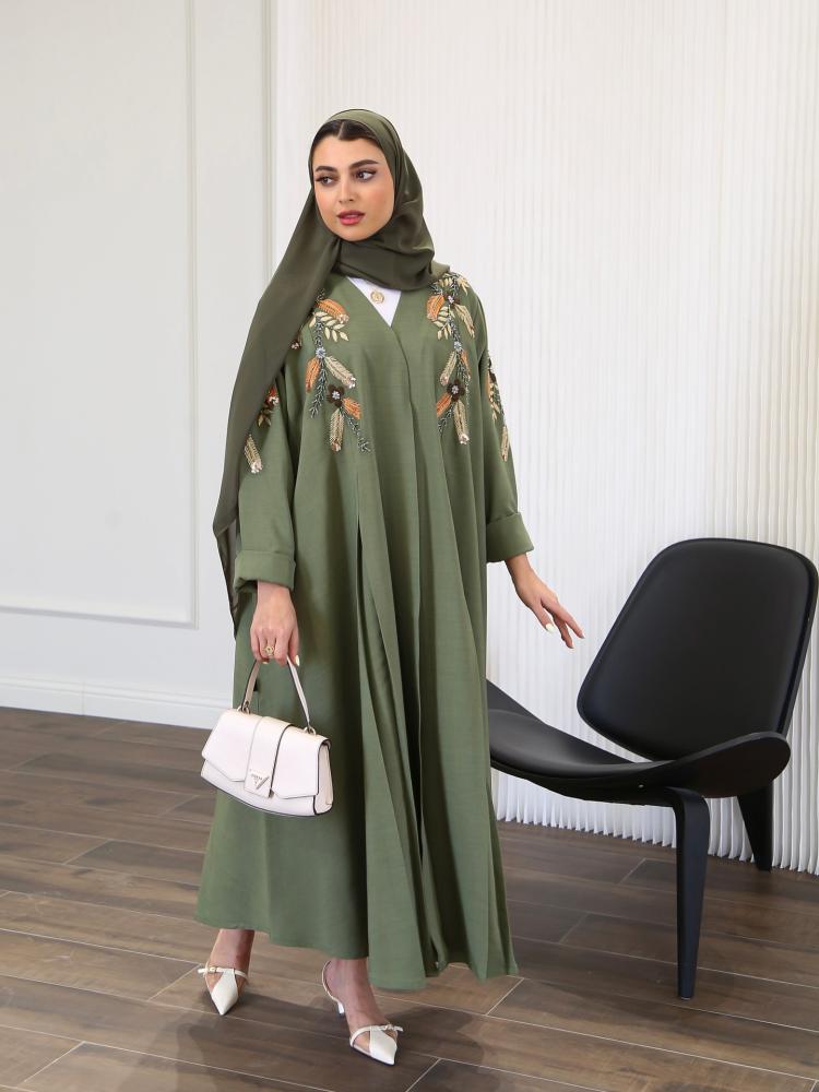✨ عباية لنن هندي بتطريز اوراق الشجر – بقصة كلوش أنيقة ✨
